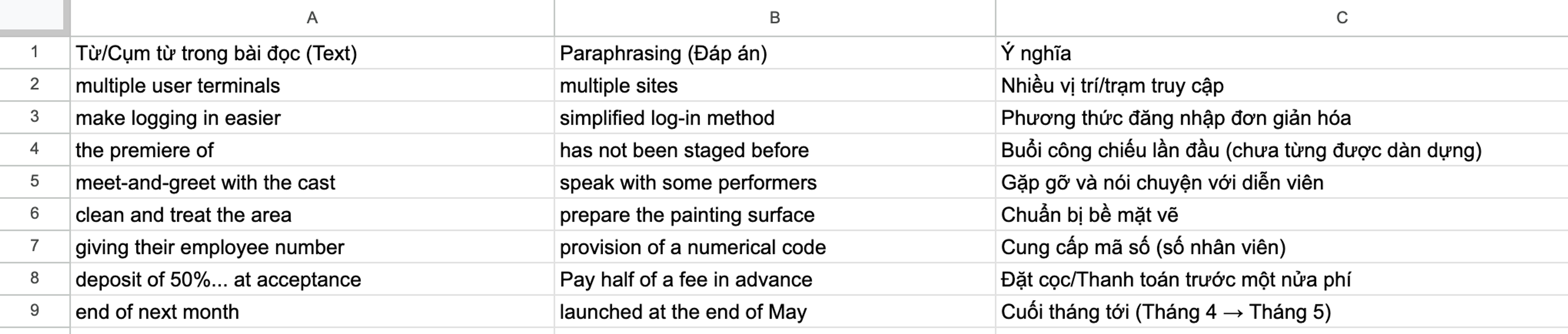 Để chinh phục Part 7, việc nắm vững các cặp từ đồng nghĩa (Paraphrasing) và cấu trúc ngữ pháp là chìa khóa "ăn điểm".