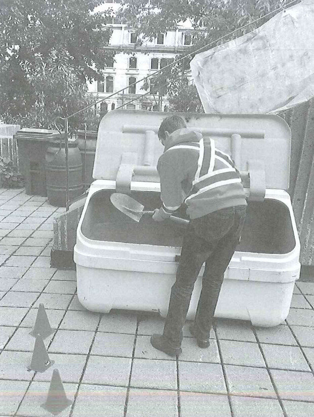 A. Anh ấy đang tựa vào một thùng chứa