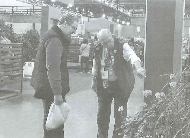 C. Một trong những người đàn ông đang chỉ vào một số bông hoa