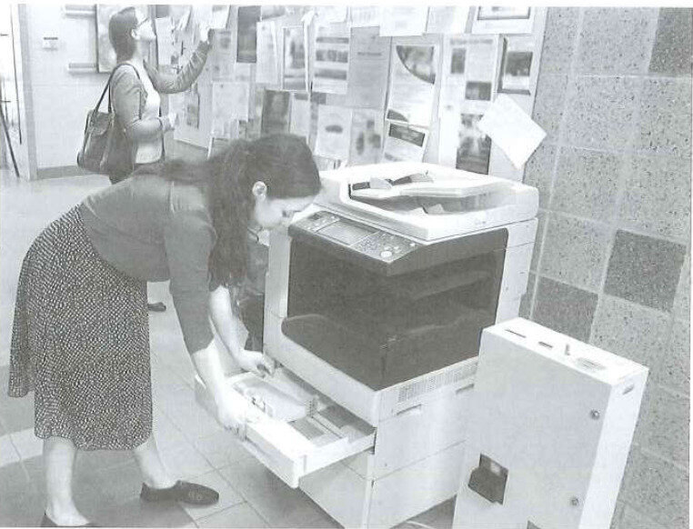B. Một trong những phụ nữ đang nhìn vào một bài đăng trên bảng thông báo.