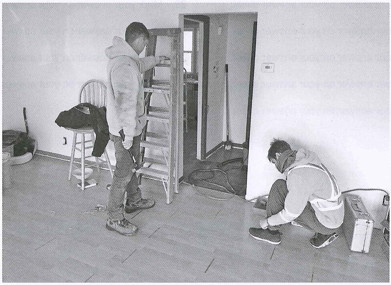 C: Một người đàn ông đang gắn một cánh cửa vào khung.