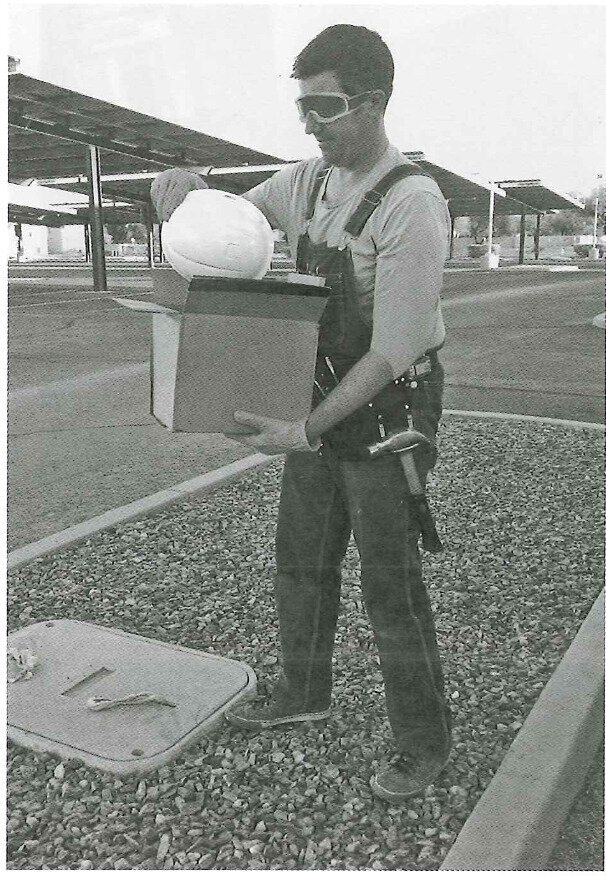 D: Anh ấy đang đặt đá trên đường lái xe.