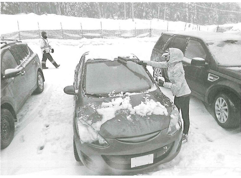 B: Một người phụ nữ đang dọn tuyết trên lối đi.