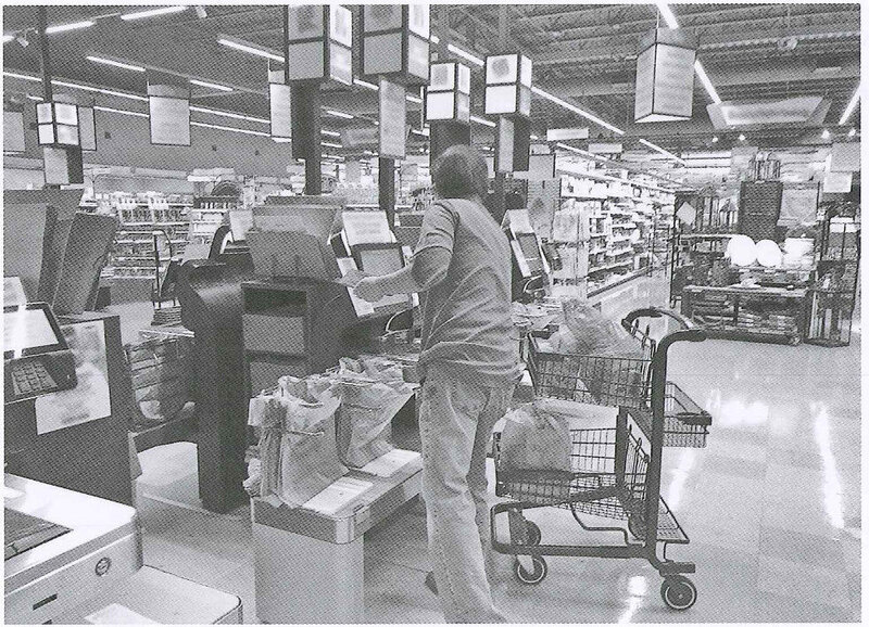 A: Một khách hàng đang đứng gần một chiếc xe đẩy mua sắm.