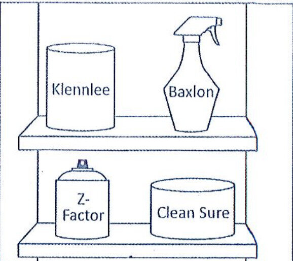 This is the custodial staff's cabinet for cleaning supplies. As part of your training, you'll be expected to learn which cleaning solutions are used for different surfaces in the hotel, such as carpet and tile flooring. $ The spray bottle on the top shelf, Baxion, is for glass surfaces. The product directly under the spray bottle is brand new. It was just released this month, and it's excellent for polishing furniture. Oh, and every Tuesday at one o'clock, a delivery truck brings any supplies that we're low on. Don't forget to check that.