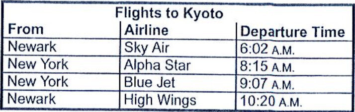 Adam, our Kyoto office just called. Our investors want me to present a project update there as soon as possible. Can you get me on the first flight to Kyoto tomorrow morning?