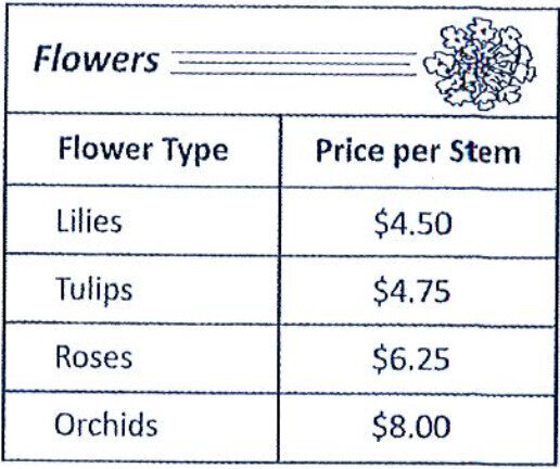 M-Cn: I know my client likes orchids, but I'm guessing those are too expensive. We'll still need a flower that's under five dollars per stem.