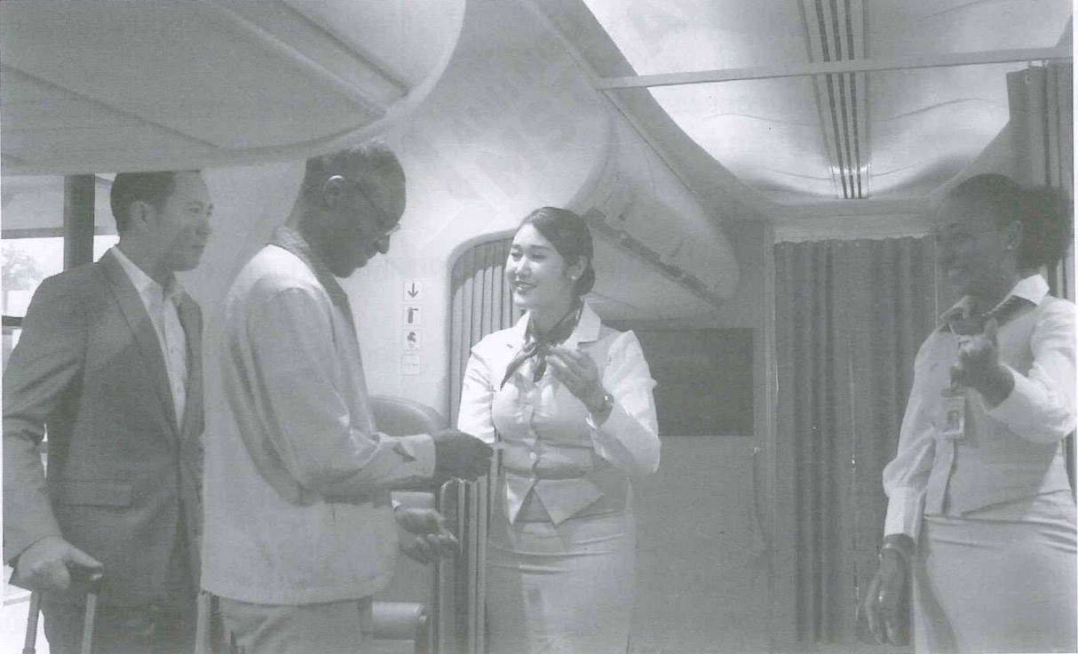 B Nhân viên hàng không đang chào đón một số hành khách.
