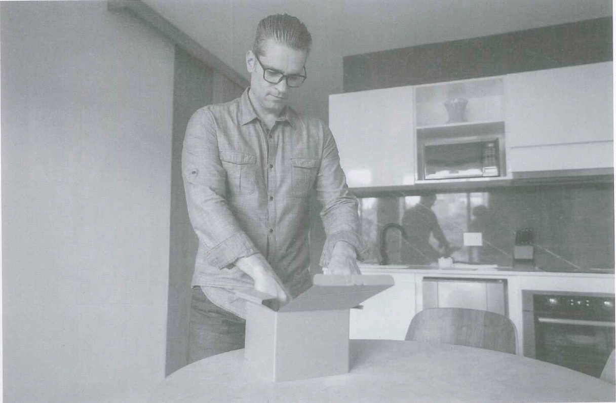 B Anh ấy đang bọc một thùng hàng bằng giấy.