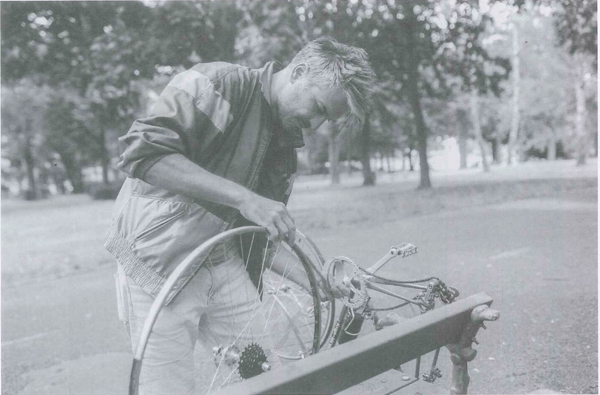 D Người đàn ông đang kiểm tra một chiếc bánh xe.
