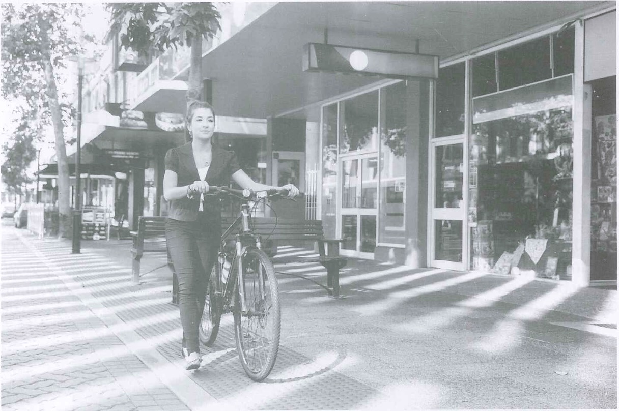 C Người phụ nữ đang khóa chiếc xe đạp vào một chiếc ghế dài.