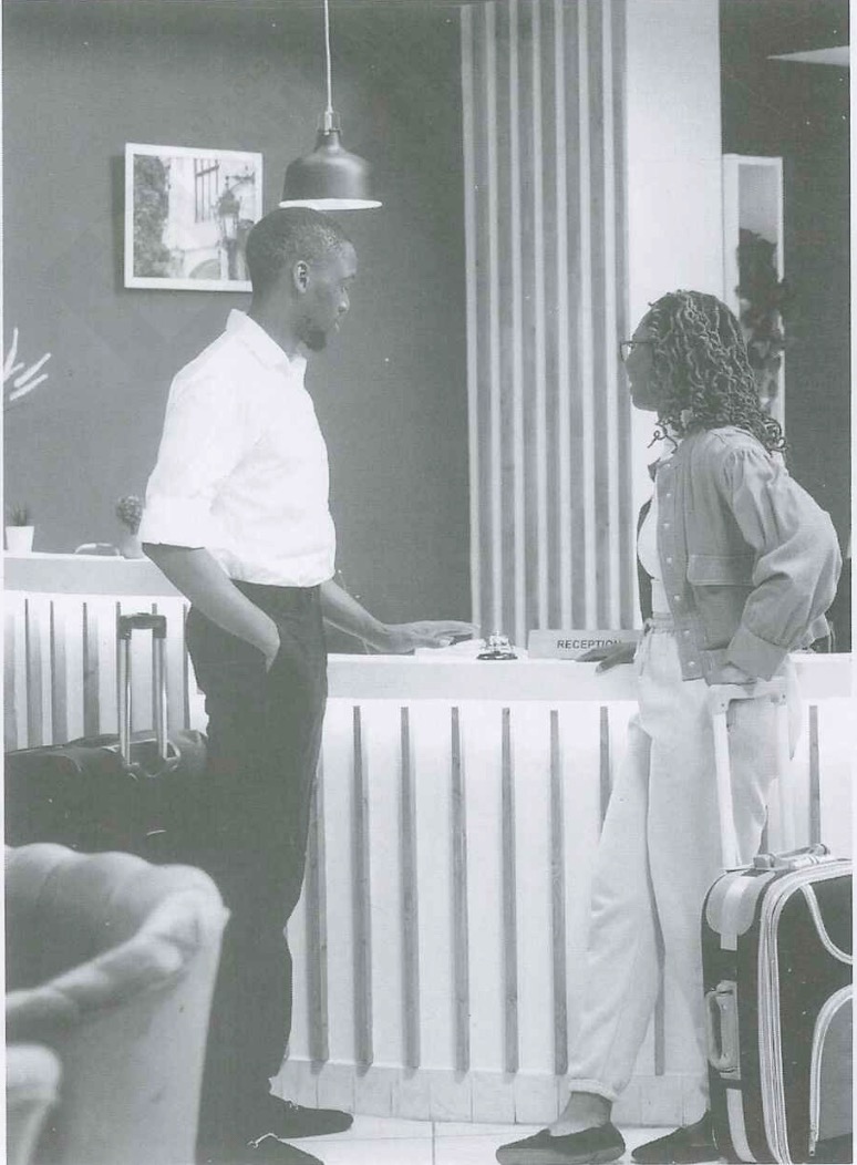 A Một nhân viên khách sạn đang hỗ trợ một khách.