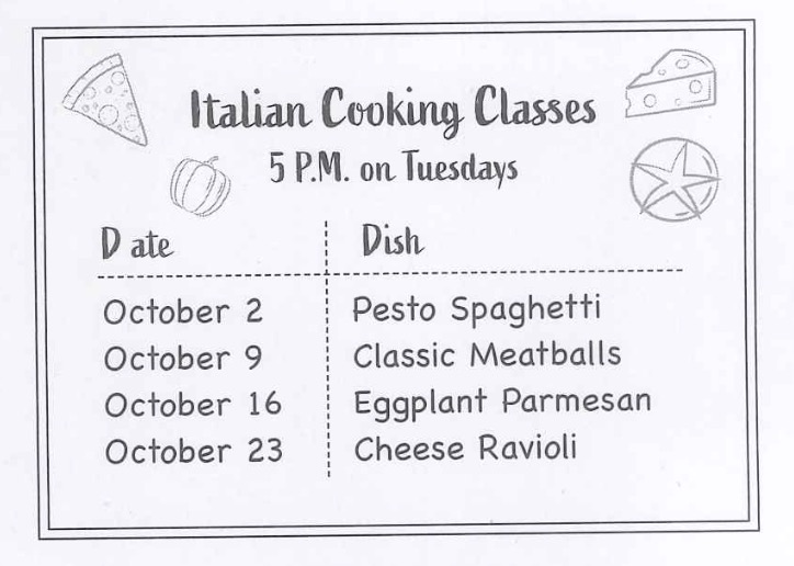 Hi, it's Sayuri. Thanks for sending me the schedule for the community center's Italian cooking classes. I agree that it would be fun to take them together. I'm quite interested in learning to make all of these dishes-except meatballs. You know I'm not a fan of meat! I wonder if I'll still have to pay for that class even though I won't attend it, or if they charge separately for each class. That information doesn't seem to be on the schedule. I'll call the community center and find out.